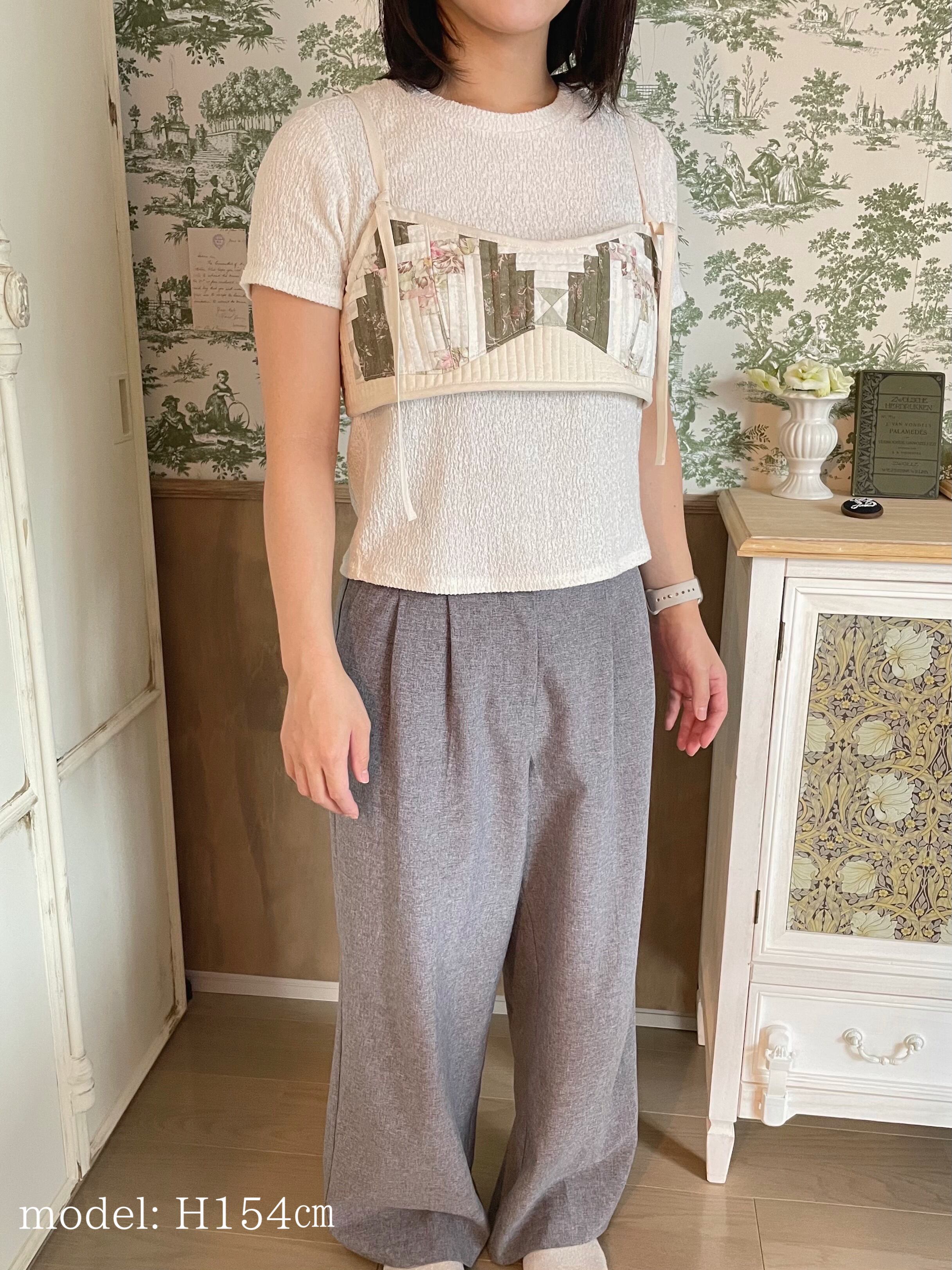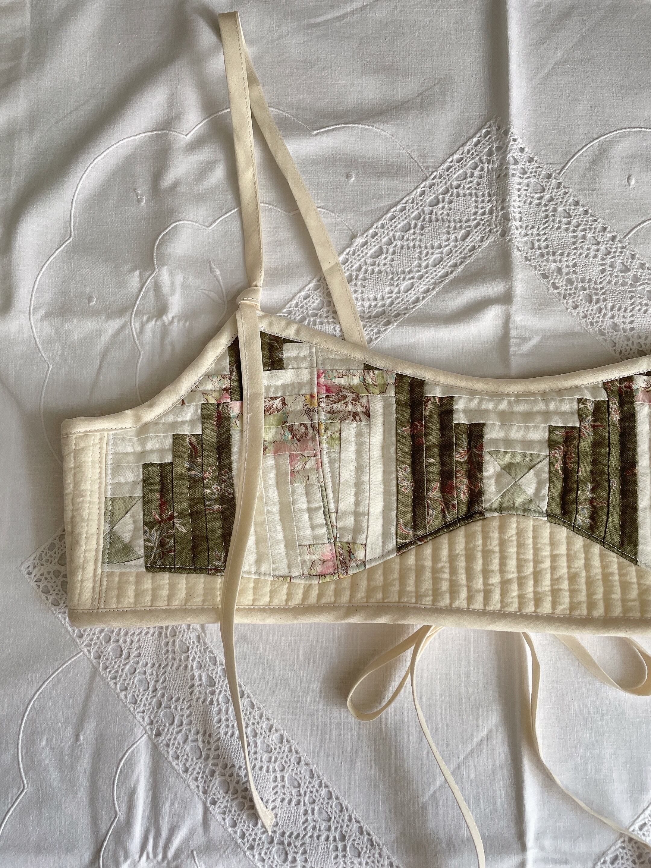 様々な生地やカラーが組み合わさったパッチワークデザインが、存在感をしっかりと演出してくれるハンドメイドのクロップド丈のビスチェです。